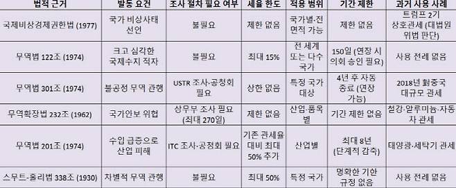 이 밖에도 수입 급증으로 산업 피해가 발생할 경우 적용하는 무역법 201조(세이프가드), 차별적 무역 관행에 대응하는 1930년 관세법 338조 등도 법적으로는 선택지에 포함된다.