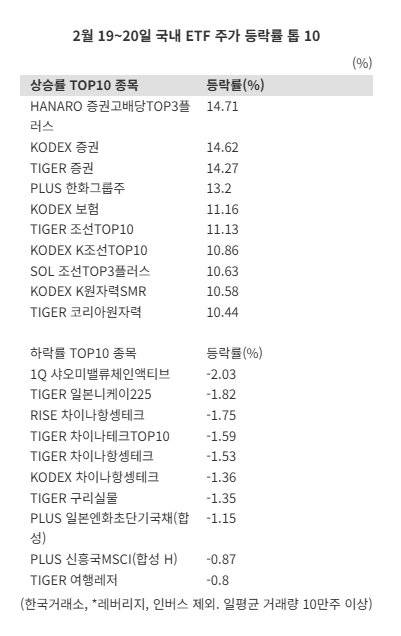 22일 한국거래소에 따르면 지난 19일부터 20일까지 가장 높은 수익률을 기록한 ETF 종목은 ‘HANARO 증권고배당TOP3플러스’로 14.71% 상승했다. 이어 ‘KODEX 증권(14.62%)’, ‘TIGER 증권(14.27%)’ 등 증권 업종 ETF가 상승률 상위권에 이름을 올렸다. 레버리지·인버스 및 일평균 거래량 10만 주 미만 종목을 제외한 기준이다.