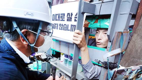 공중은 아슬아슬했다. 여섯 사내가 13m 높이의 미완성 구조물 난간에 자리해 초췌한 모습으로 쉼 없이 ‘팔뚝질’을 하며 구호를 외쳤다.