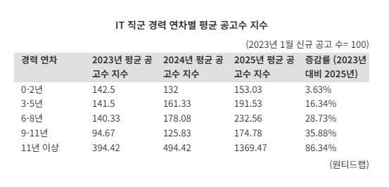 고숙련 경력직 선호 현상은 심화되고 있는 것으로 나타났다. 원티드랩 전체 IT 직군 공고 중 0~2년차의 신입 채용 공고수는 지난 2023년에 비해 2025년 3.63% 증가한 반면에 △3~5년차 16.34% △6~8년차 28.73% △9~11년차 35.88 등 고연차 일수록 더욱 가파르게 늘어난 것으로 나타났다. 절대적인 공고수는 적지만 11년차 이상 IT 직군의 경력직의 공고수는 같은기간 86.34% 증가하기도 했다.
