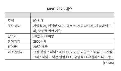 [파이낸셜뉴스] 세계 최대 이동통신 전시회인 '모바일월드콩그레스(MWC) 2026'가 다음 달 2일(현지시간) 스페인 바르셀로나에서 나흘 일정으로 막을 올린다. 올해 MWC 주제는 'IQ 시대(The IQ Era)'다. 인간의 통찰력과 더 고도화된 AI를 접목한 새로운 네트워크와 제품들을 통해 실질적 성과를 내는 미래가 중점적으로 제시될 전망이다. 전 세계 205여개국, 2900여개 기업이 참여해 AI 기술 우위를 증명하기 위한 각축전이 벌어질 것으로 전망된다.