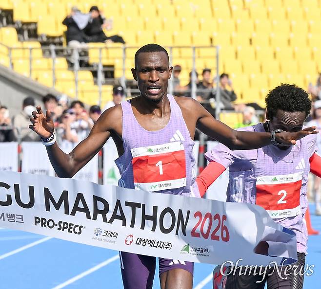 역대 최대 규모인 4만1000여 명의 국내외 마스터즈 선수가 참가한 '2026 대구마라톤' 대회에서 게브리엘 제럴드 게이(탄자니아) 선수가 2시간 8분 11초의 기록으로 남자부 대회 2연패를 달성했다.