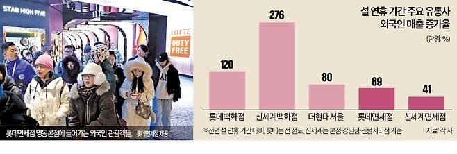 지난 설 연휴 기간 국내 백화점과 면세점의 외국인 매출 증가율이 전년 대비 최대 276%을 기록하며, 주요 유통사들이 '관광객 특수'를 누린 것으로 나타났다.