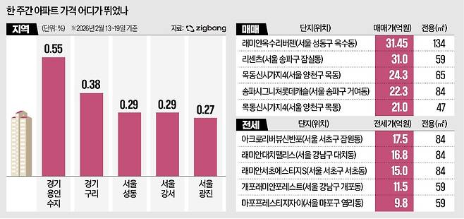 지난주 전국 시·군·구 가운데 한국부동산원 기준 아파트 가격이 가장 많이 오른 곳은 경기 용인 수지구였다. 한 주 동안 0.55% 뛰었다. 올해 상승률은 4.09%다. ‘규제 풍선효과’ 지역으로 주목받는 경기 구리(0.38%)가 뒤를 이었다. 경기권이 상대적으로 덜 오른 데다 절대 금액이 적어 수요가 몰리고 있다. 서울 성동(0.29%), 강서(0.29%), 광진(0.27%) 등도 많이 오른 편에 속했다.