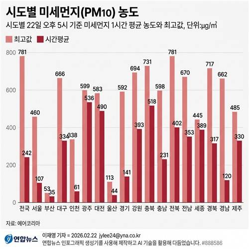 오후 5시 기준 시도별 1시간 평균 미세먼지(PM10) 농도를 보면 광주 536㎍/㎥, 충북 518㎍/㎥, 대전 490㎍/㎥, 전북 402㎍/㎥, 강원 393㎍/㎥, 세종 383㎍/㎥, 전남 363㎍/㎥, 대구 334㎍/㎥, 제주 330㎍/㎥, 경북 317㎍/㎥, 충남 231㎍/㎥, 경기 141㎍/㎥, 서울 107㎍/㎥ 등 인천과 경남을 제외하면 모두 '매우 나쁨'(151㎍/㎥ 이상) 또는 '나쁨'(81∼150㎍/㎥) 수준으로 미세먼지가 많은 상황이다.