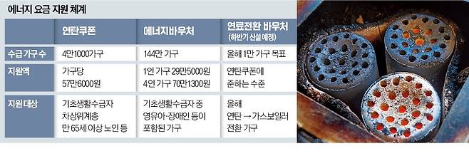 현재 연료비 지원체계는 크게 연탄 쿠폰과 에너지바우처로 나뉜다. 연탄 쿠폰은 연탄을 사용하는 기초생활수급자와 차상위계층 등에 가구당 57만6000원(2026년 기준)을 지원한다. 에너지바우처는 지원 요건이 더 까다롭다. 기초생활수급자 가운데 영유아, 임신부, 장애인 등이 포함된 가구에만 전기, 도시가스, 등유 등의 연료비를 지원한다.