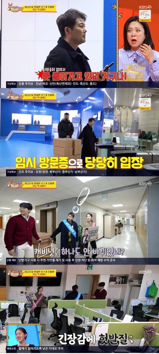 전현무는 사원증이 없어서 못 들어가고 있다고 했다. 엄지인은 웃음을 터트리면서 데리러 내려가겠다고 했다.