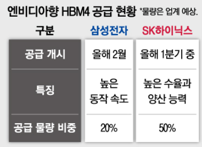 올해부터 엔비디아에 공급되기 시작하는 HBM4는 삼성전자가 먼저 출하했지만 전체 공급량에서는 SK하이닉스가 우위를 점할 것으로 예상된다. 삼성전자는 최대 13Gbps(초당 13기가비트)까지 구현할 수 있는 HBM4를 2월부터 먼저 공급하기 시작했다.