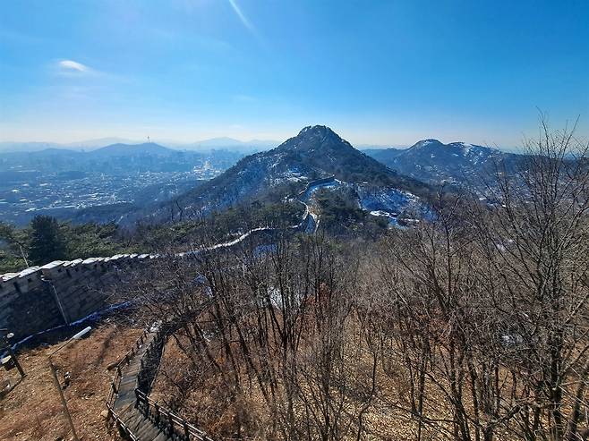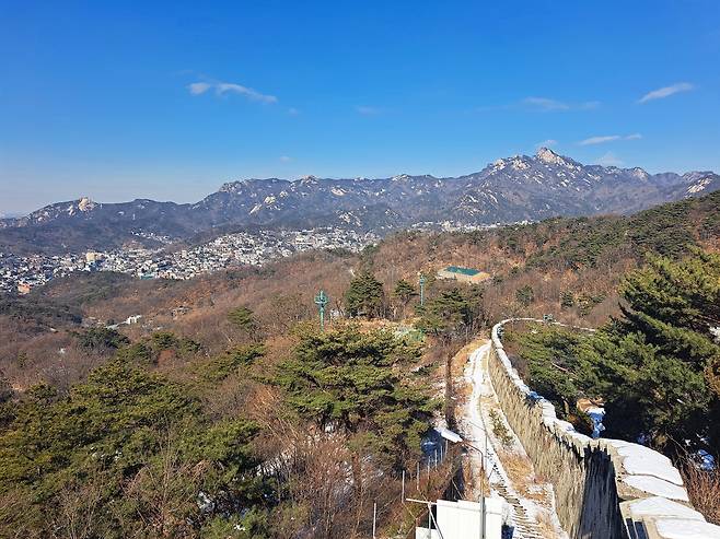 | ▲ 백악산 백악 곡장에서 바라 본 백악산. 도성 법궁인 경복궁의 뒤를 지키는 산이다. 한양도성 성벽이 길게 뻗어 백악 마루로 향하고, 너머로 인왕산에도 성벽이 아스라하다. 왼쪽으로 어렴풋이 남산과 관악산이 보인다. |