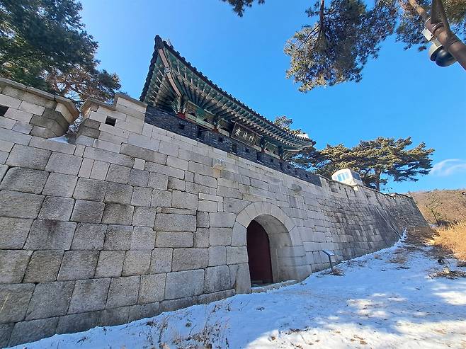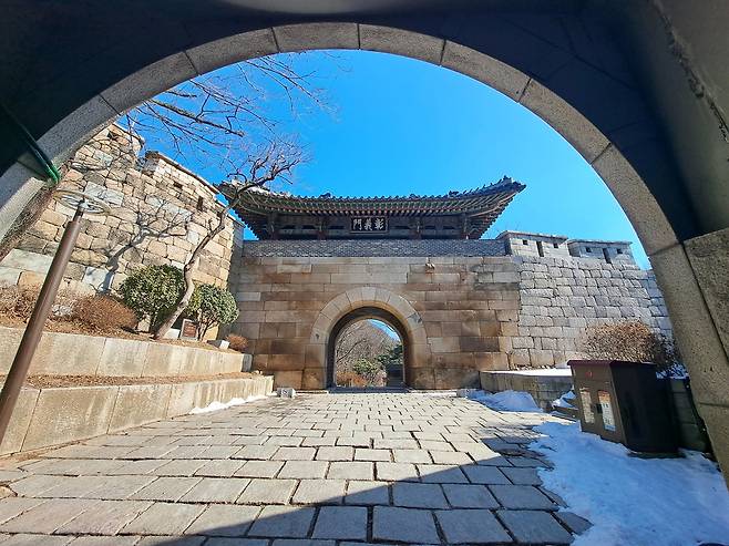 | ▲ 숙정문 무지개 모양 문은 왕조시대 내내 닫혀 있었다. 1.21(1968) 후인 1976년 성벽 위에 벽돌로 여장을 쌓고, 문루를 앉혔다. 현판은 그때 쓰였다. 사진 오른 쪽으로 쌓은 모양이 다른, 각 시대의 성벽이 보인다. 사진은 2월 초의 전경. |