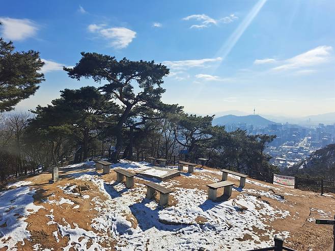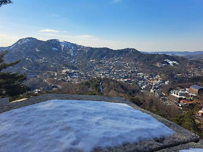 | ▲ 청운대 백악 마루로 오르는 중간 지점에서 일종의 쉼터다. 사진 오른쪽으로 경복궁과 육조거리, 남산이 또렷하다. |