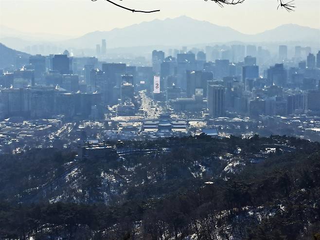 | ▲ 경복궁과 육조거리 촛대바위에서 바라 본 경복궁과 광화문 광장. 관악산을 향한 근정전-광화문으로 이어지는 건축선이 명확하며, 육조거리였던 광화문 광장과 틀어진 모습을 볼 수 있다. |