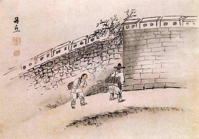 | ▲ 성하부전도(城下負錢圖) 단원 김홍도의 그림. 각기 다른 시대에 쌓인 성벽을 배경으로, 길을 가는 보부상으로 추정되는 인물들 모습이 그려져 있다. |