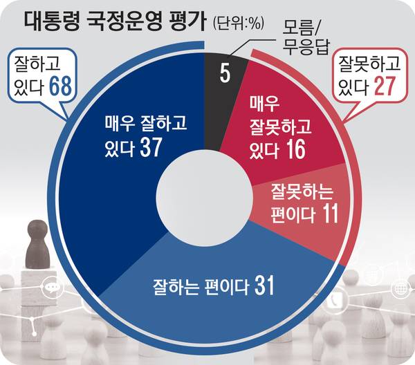 이재명 대통령의 국정운영을 묻는 질문에 응답자의 68%는 ‘잘하고 있다’고 평가했다.