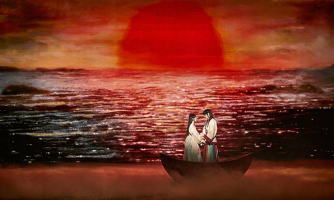 한국적 미학을 추구하는 작품답게 발광다이오드(LED) 화면 위에서 살아 움직인 수묵 애니메이션도 강렬한 인상을 남겼다. 이모셔널씨어터가 설계한 무대와 조명 그리고 탁영환 작가가 한지와 수묵으로 제작한 영상이 무대 전체를 채웠다. 눈을 잃은 도미가 나룻배를 타고 한강을 흘러가는 장면은 그야말로 움직이는 산수화다.