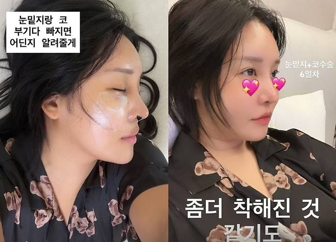 당시 그는 "눈밑 지방 재배치는 멍도 안 들고 안 붓는다고 들었는데, 나는 지금 피멍이 들어서 눈알이 다 터졌다. 아침에 벌 500방 쏘인 줄 알았다"며 수술 여파로 인한 심한 부기를 호소했다.