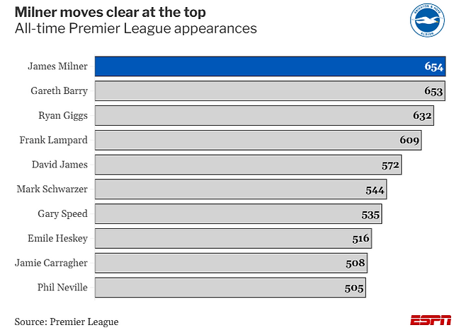 '꾸준함의 상징'으로 불려온 베테랑 미드필더 제임스 밀너(40)가 22일(한국시간) 영국 런던의 지테크 커뮤니티 스타디움에서 열린 브라이턴 앤드 호브 앨비언과 브렌트포드의 잉글리시 프리미어리그(EPL) 27라운드 맞대결에서 통산 654번째 리그 출전을 기록하며 역대 최다 출전 기록을 새롭게 썼다. 이로써 밀너는 종전 최다 출전 경기수를 기록했던 가레스 배리(653경기)를 단 한 경기 차로 제치고 역대 1위에 올랐다.