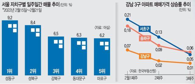 22일 부동산 빅데이터업체 아실에 따르면 서울은 대부분 자치구에서 매물이 증가 추세다. 전날까지 일주일간만 따져도 서울 전역에서 매물이 3.4% 증가했다. 전국에서 가장 높은 증가율이다. 자치구별로 보면 성동구가 9.2% 늘었고 성북구 8.4%, 강북구가 6.5% 등으로 뒤를 이었다. 대부분 지난해 집값 상승폭이 컸던 지역이 상위권에 놓였다.