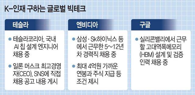 늘 ‘사람이 부족하다’는 반도체 산업이지만, 최근 테슬라, 구글을 비롯한 빅테크들의 주문형반도체(ASIC) 제작 경쟁에 불이 붙으면서 인력난은 더욱 극심해지고 있다. AI 반도체 분야의 최강자 엔비디아도 폭증하는 수요에 인력 확보가 절실한 상황이다. 이들 기업은 현재 모두 한국과 미국에서 근무할 고대역폭메모리(HBM) 엔지니어를 모집 중이다. 일론 머스크 테슬라 최고경영자(CEO)는 지난 16일 본인의 소셜미디어(SNS)에 태극기 이모티콘과 함께 테슬라코리아 채용 공고를 공유하며 “한국의 유능한 엔지니어들은 테슬라와 함께하자”고 공개 제안했다. 엔비디아는 삼성전자와 SK하이닉스 등 반도체 기업에서 근무한 5~12년 차 경력직을 찾고 있다. 최대 4억원에 가까운 연봉과 주식 지급을 조건으로 내건 것으로 알려졌다.