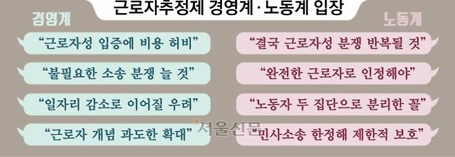 A. 예상과 달리 입법에 반대하고 나섰다. 노동계는 일터 기본법에 대해 “근로기준법 밖에 있고, 강제성이 없고, 후속 입법도 미지수여서 미흡하다”고 주장한다. 근로자 추정제에 대해선 “민사 소송에 한정돼 있고, 평상시에는 근로자로 인정되지 않고 법적 분쟁이 일어나야만 작동하기 때문에 사후 구제에 불과하다”고 지적한다. 민주노총은 “현재 플랫폼 노동자들은 실효성이 크지 않은 일하는 사람 기본법과 정부의 노동자 추정 패키지 법안을 원하지 않는다”며 재논의를 촉구했다. 노동계 일각에서는 “고용주가 근로 계약서도 없으니 근로자가 아니라고 우기면 그만”이라는 볼멘소리도 나온다.
