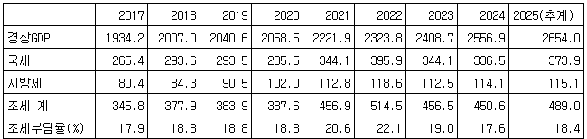 [표] 2017∼2025년 조세수입·조세부담률(단위 : 조원)