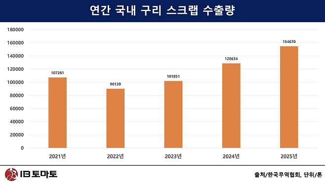 13일 금속업계에 따르면 구리 스크랩 수출량은 꾸준히 늘어나는 추세로 파악된다. 한국무역협회에 따르면 구리 스크랩 수출량은 지난해 15만 4670톤을 기록한 것으로 나타났다. 이는 2024년(12만 8634톤)보다 20%가량 늘어난 양이다.