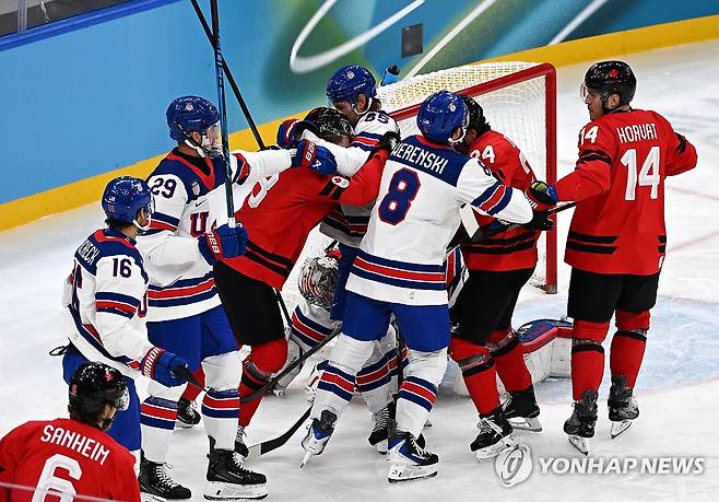 (밀라노=연합뉴스) 서대연 기자 = 22일(현지시간) 이탈리아 밀라노 산타줄리아 아이스하키 아레나에서 열린 2026 밀라노·코르티나담페초 동계올림픽 아이스하키 남자 금메달 결정전에서 감정이 격해진 미국과 캐나다 선수들이 싸우고 있다. 2026.2.23 [공동취재]