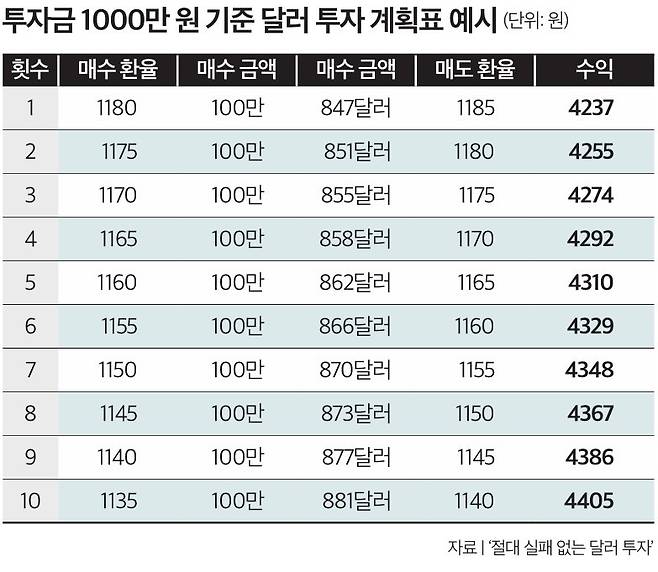 달러 투자는 어떤 방식으로 해야 하나."정답에 가까운 공식이 있다(표 참조). 먼저 달러는 1180원, 엔화는 1020원 이하일 때 첫 매수를 시작한다. 총 투자금을 10회로 나눠 분할매수하고, 첫 매수 이후 환율이 5원 떨어질 때마다 한 번씩 추가로 산다. 이후 내가 산 가격보다 5원 오르면 해당 물량만 매도한다. 5원을 기준으로 삼은 이유는 최근 5년간 환율의 일평균 변동 폭을 고려한 값이기 때문이다.