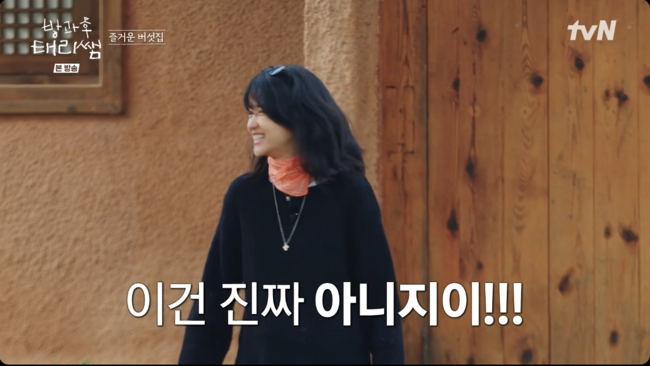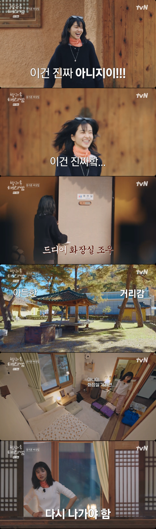 이후 체육관 뒤편에 마련된 숙소 '버섯집'에 짐을 풀던 김태리는 숙소 내부에 화장실이 없자 당황하기도. 마당으로 나가 멀리 떨어진 화장실 위치를 확인한 김태리는 “이건 진짜 아니지. 이건 진짜”라며 황당함 섞인 분노를 표출했다.