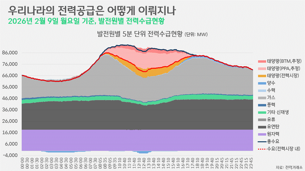 그렇다면, 우리나라의 전력은 어떨까. 모두가 잠든 새벽, 전력수급 그래프의 골짜기도 깊어집니다. 평일인 지난 9일 기준, 새벽 3시 35분에 우리나라의 수요는 최저 61GW까지 떨어집니다. 하나둘 눈을 뜨고, 도시가 깨어나며 수요는 삽시간에 늘어납니다. 오전 10~11시 사이, 93GW를 넘어서며 최대치를 기록했죠. 이후 조금씩 줄어들던 수요는 퇴근 시간 무렵부터 급격히 줄어들기 시작해 밤 11시 55분, 71.3GW까지 떨어졌습니다.