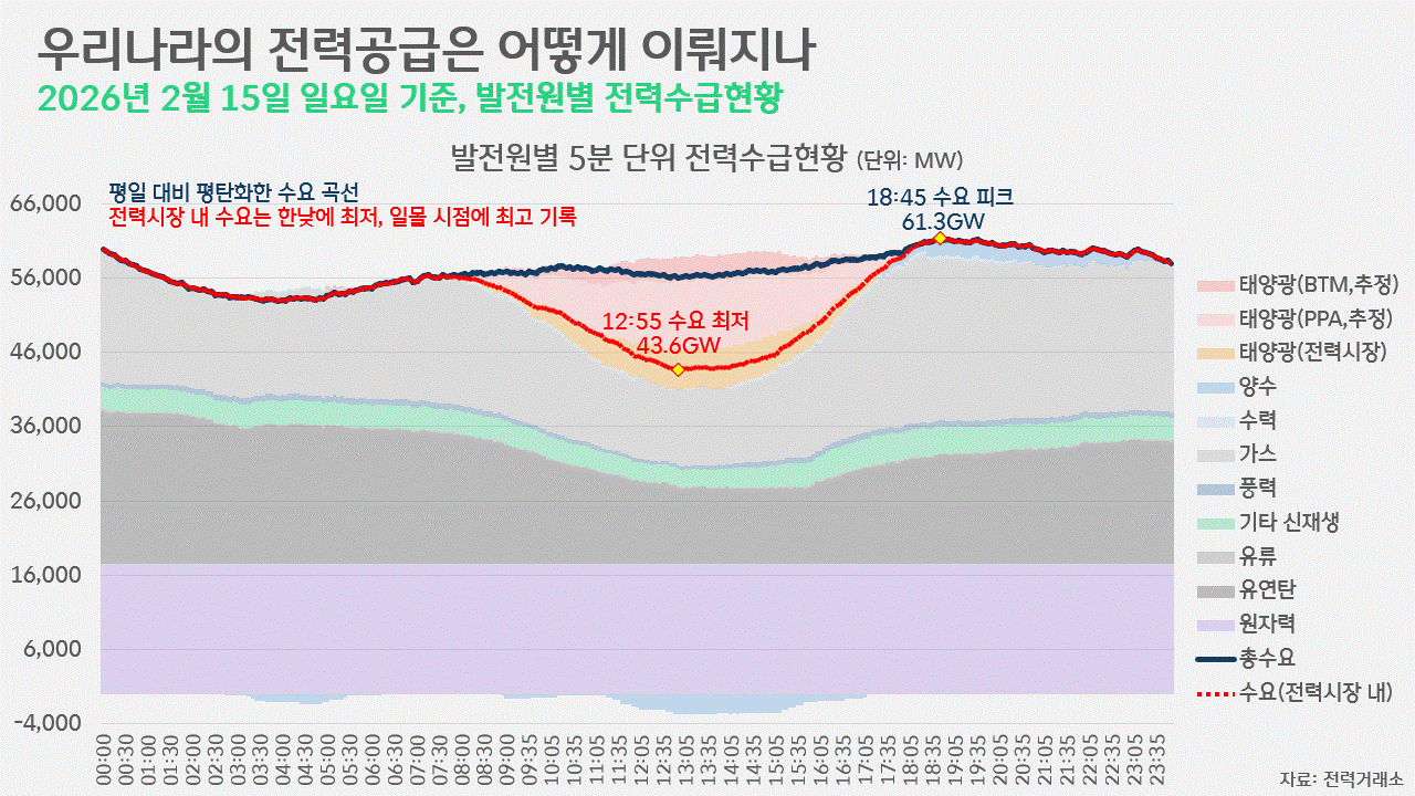 이를 반대로 바라보면 어떨까. 새로 확장되고 있는 청정 발전원을 아래에, 전통 전원을 위에 배치해보면, 이전까지의 그래프에선 미처 보이지 않았던 것들이 보다 쉽게 드러납니다. 간헐성이라는 표현으로 '안정적인 전력수급을 위협한다'고 공격당하던 VRE의 출력은 수요의 증감과 시간대를 비슷하게 맞추는 역할을 하는 것이 시각적으로도 확인됩니다. 그 덕에 총수요 대비 전력시장 내 순수요의 하루 중 변동폭은 줄어들게 됐습니다.
