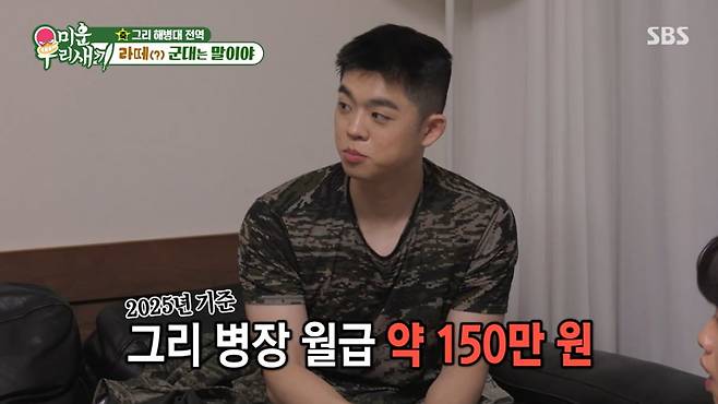 군인 월급에 대한 이야기도 나왔다. 그리는 "병장 때 약 150만 원이다. 적금까지 합치면 200만 원"이라고 밝혔다. 조진세가 "목돈을 모아올 수 있겠다"며 놀라자, 그리는 "저는 2000만 원 가까이 모았다. 병장이 월급은 많이 받고 하는 일은 적어져서, 여기 눌러 살고 싶다는 생각을 갑자기 하게 되더라. 마지막에는 사회 나가서 바로 일 없으면 조금 더 있고 싶다고 생각했다"며 웃음을 자아냈다.