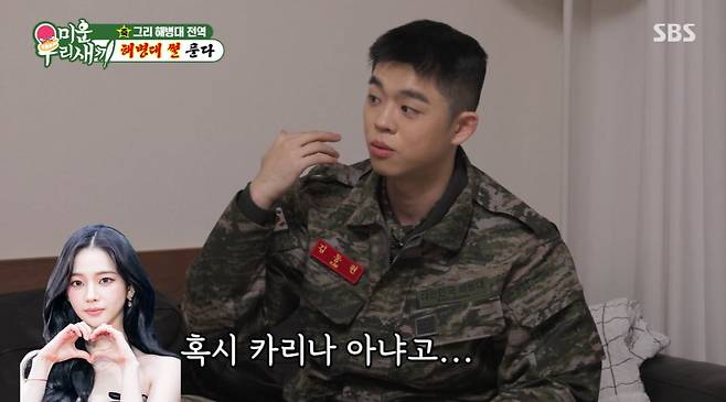 그리는 군 생활 도중 에스파 카리나 덕을 봤다고. 그리는 "훈련소에서 친해지면 '친한 여자 연예인 있냐', '에스파 아냐' 막 질문하길래 '안다'고 했더니 나를 동경하는 눈빛으로 쳐다보더라. 그래서 '나 리나랑 안다'고 허세를 떨었다"며 웃음을 안겼다. 이어 "주말마다 종교 활동을 가는데, 가면 초코과자를 받을 수 있다. 카리나랑 친하다고 하니까 그걸 바치더라"라고 털어놨다. 또한 "덕분에 군 생활 편했다"면서 카리나에게 즉석 영상 편지를 남겼다.
