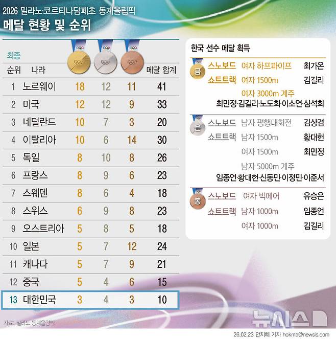 [그래픽] 2026 밀라노·코르티나담페초 동계올림픽 최종 순위