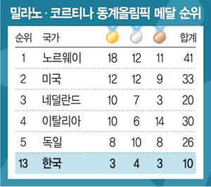 한국, 금3 은4 동3 ‘종합 13위’… 젊은피로 ‘절반의 성공’[2026 밀라노·코르티나 동계올림픽]