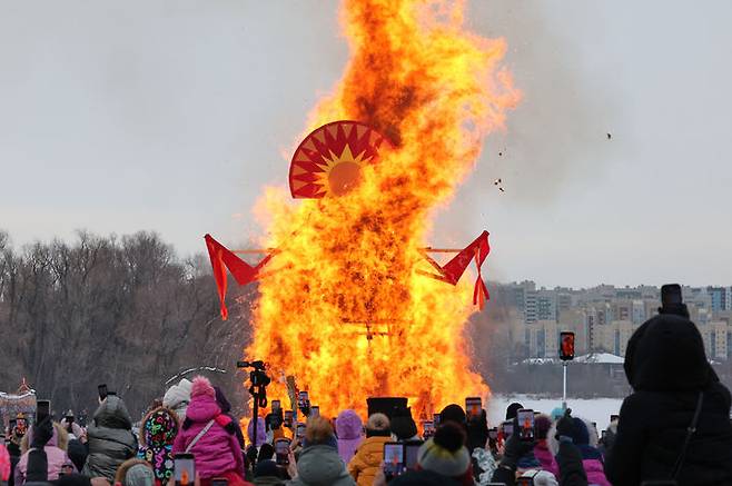 [상트페테르부르크=AP/뉴시스] 22일(현지 시간) 러시아 상트페테르부르크에서 전통 축제 마슬레니차가 열려 겨울을 상징하는 마슬레니차 인형이 불에 타고 있다. 러시아인들은 겨울이 끝날 무렵 팬케이크를 먹으며 봄을 맞이하는 봄맞이 축제로 겨울 인형을 불에 태우며 풍요를 기원한다. 2026.02.23.