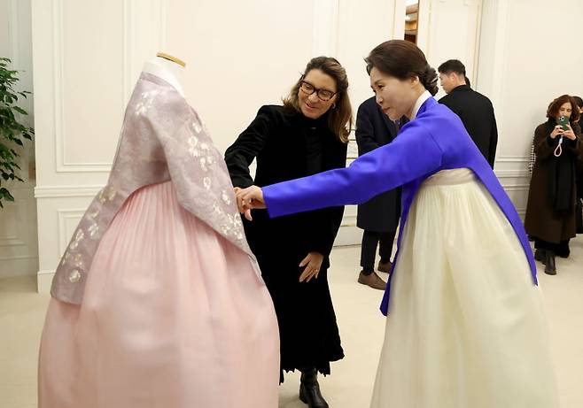 이어 잔자 여사에게 "나중에 입으면 더 아름다울 것 같다"고 인사를 건넸고, 잔자 여사는 한국어로 "감사합니다"라고 화답했다. 두 여사는 한복 앞에서 기념 촬영도 진행했다.