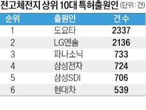 다출원인 상위 10곳 가운데 일본 기업은 도요타 등을 포함해 5곳이 이름을 올렸다. 전기자동차 시장이 둔화 국면에 들어섰지만 차세대 배터리 주도권을 둘러싼 기업·국가 간 특허 경쟁이 한·중·일을 중심으로 오히려 가속화하는 흐름이다.