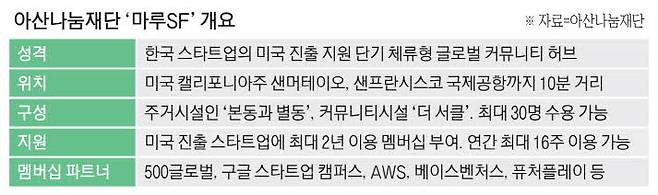 아산나눔재단이 미국 실리콘밸리에 만든 첫 거점인 '마루SF'에서 다양한 스타트업이 성공의 꿈을 꾸고 있다. 마루SF는 아산나눔재단이 미국 캘리포니아주 샌머테이오에 처음으로 설립한 해외 거점으로 스타트업의 미국 진출을 지원하는 글로벌 커뮤니티 허브다. 아산나눔재단이 운영하는 기업가정신 플랫폼 마루와 샌프란시스코를 결합해 명명했다.