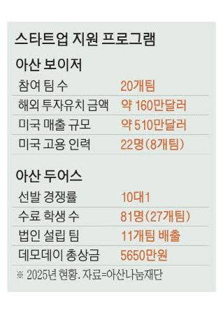 아산나눔재단은 창업 생태계의 흐름과 구조적 특성을 고려해 2025년을 글로벌 확장의 원년으로 삼고 스타트업 지원에 본격 나서는 중이다. 이와 함께 글로벌 이니셔티브의 연장선상에서 초기 스타트업의 미국 진출을 지원하는 '아산 보이저'와 예비 글로벌 창업가를 육성하는 '아산 두어스' 등 배치 프로그램을 운영하며 국내 창업가들이 세계 시장과 연결될 수 있는 구조를 마련했다.