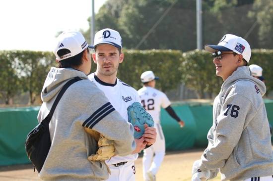 23일 두산의 일본 미야자키 2차 스프링캠프 훈련 첫날에 합류한 잭로그는 캐치볼로 가볍게 몸을 풀며 몸 상태를 끌어올렸다. 특유의 친화력으로 동료들과도 어색함 없이 어울렸다.