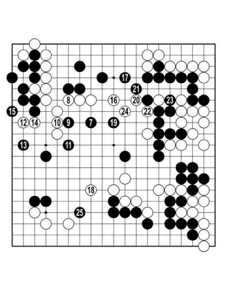 박정환은 흑 세력을 집짓기보다 백 대마를 공격하는 데 썼다. 불타오르는 사나운 공세를 펼친 것은 아니었다. 흑11, 19에 보듯이 백 대마가 가운데로 나오지 못하게 막았을 뿐이다. 백24에 지켰으나 이 대마가 완전히 살아 있지 않다. 백18로 뛴 돌들은 흑25가 오니 아래쪽과 손을 잡기 어려워졌다.