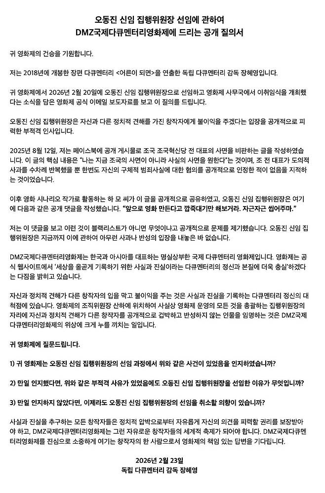 장 전 의원은 질의서에서 "2018년에 개봉한 장편 다큐멘터리 <어른이 되면>을 연출한 독립 다큐멘터리 감독"이라고 스스로를 소개했다. 그는 "2026년 2월 20일에 오동진 신임 집행위원장으로 선임하고 영화제 사무국에서 이취임식을 개최했다는 소식을 담은 영화제 공식 이메일 보도자료를 보고 이 질의를 드린다"고 밝혔다.