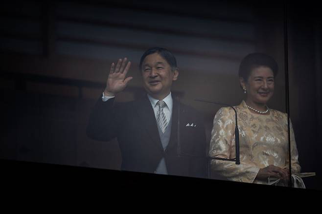 [도쿄=AP/뉴시스] 66번째 생일을 맞은 나루히토 일왕이 부인 마사코 왕비와 함께 23일 일본 도쿄 왕궁 발코니에서 일반인 하객들에게 인사하고 있다. 2026.02.23.