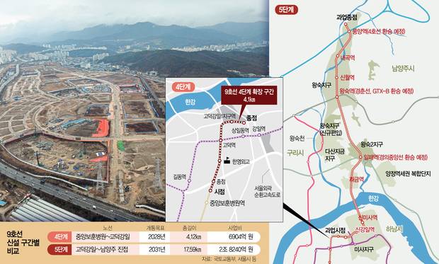 23일 국토교통부와 서울시에 따르면 2023년 1월 착공한 9호선 4단계 사업(총연장 4.12㎞)은 현재 30%대 공정률을 보이고 있다. 5단계인 강동하남남양주선(총 연장 17.59㎞)은 2024년 12월 대도시권광역교통위원회의 기본계획 승인을 받아 이르면 올 하반기 착공을 앞두고 있다.