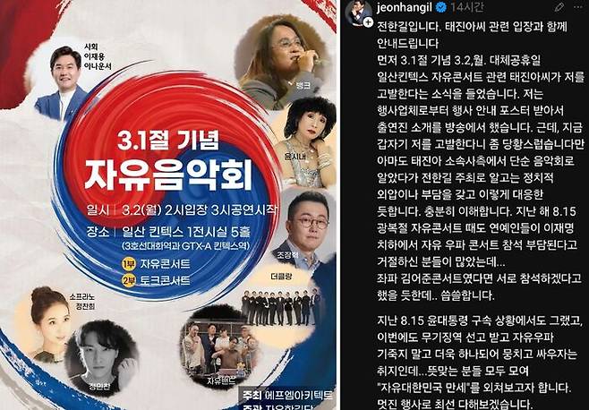 앞서 유튜브 채널 '전한길 뉴스'는 오는 3월 2일 고양시 킨텍스에서 열리는 '3·1절 기념 자유음악회'를 홍보하며 가수 태진아, 뱅크, 윤시내, 조장혁, 더 클랑과 자유밴드, 소프라노 정찬희, 정민찬 등의 사진이 담긴 포스터를 공개했다.