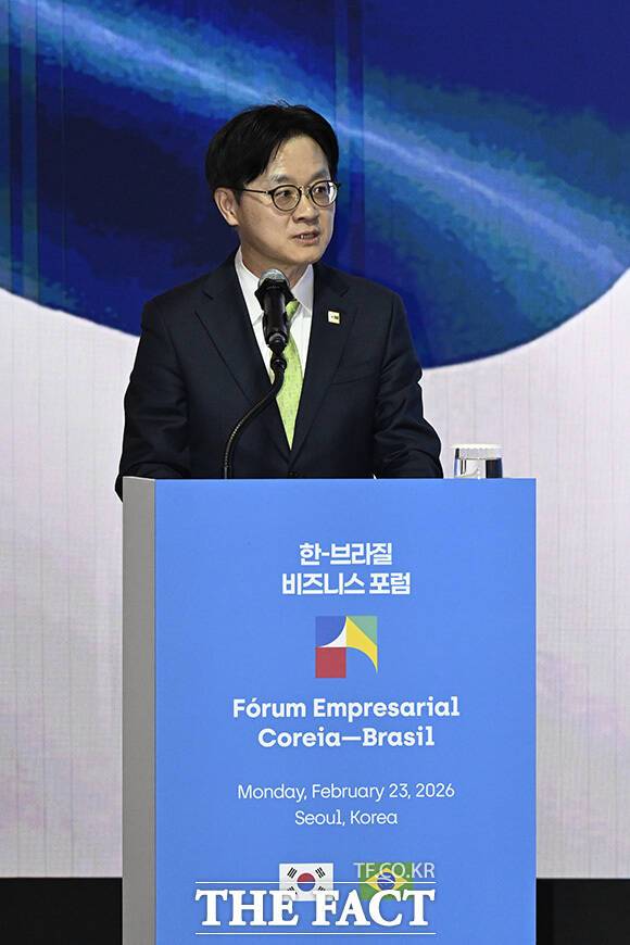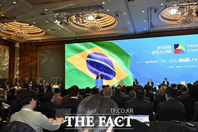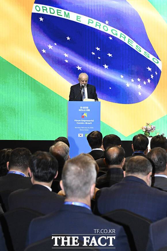 [더팩트 | 송호영 기자] 국빈 방한 중인 루이스 이나시우 룰라 다시우바 브라질 대통령이 23일 오후 서울 중구 롯데호텔서울 크리스탈볼룸에서 열린 '한-브라질 비지니스 포럼'에 참석해 발언하고 있다.