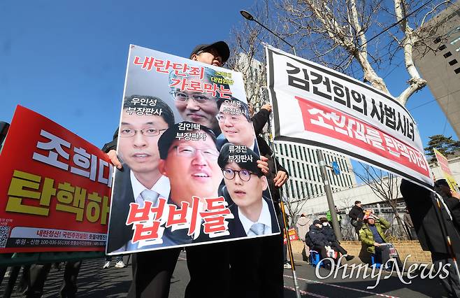 | ▲ 촛불행동, 사법부 규탄 촛불행동 주최로 지난 19일 오후 서울 서초구 대법원 앞에서 열린 '윤석열 사형선고 촉구 집회'에서 참석자들이 조희대 대법원장을 비롯한 사법부를 규탄하는 피켓을 들고 있다. |