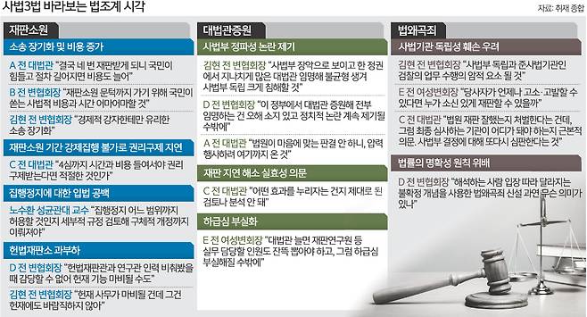 23일 전직 대법관들과 대한변호사협회장 등 법조계 원로들은 민주당이 추진하는 사법개혁에 절차적인 흠결이 있다고 입을 모았다. 과거 진보 정권에서 임명된 한 전직 대법관은 “법관이 여론이나 주류 정치 세력의 의견에 흔들리지 않고 오로지 양심에 따라 재판을 해야 한다는 게 현 사법체계의 근간이고 인류가 역사와 경험을 통해 얻은 지혜”라며 “다수당의 입맛에 맞지 않는 재판과 판결을 했다고 사법개혁을 추진하는 건 ‘절대다수의 의견으로부터 독립해 재판할 수 있어야 한다’는 사법의 기본 원칙과 큰 괴리가 있다”고 지적했다. 또 “재판소원 도입, 법관 및 검사에 대한 처벌이 가능한 법 왜곡죄 도입은 국민 투표를 통한 개헌 등 헌법적 논의가 필요한데도 충분한 숙의 과정도, 절제도 없다”라고 꼬집었다. 김현 전 변협회장은 “사법개혁을 추진하며 의견 수렴 절차를 일절 거치지 않고 여당이 졸속으로 진행하는 것은 국가적으로 두고두고 아주 큰 후유증을 안길 것”이라고 했다. 또 다른 전직 변협회장은 “우리 헌법은 3심제를 예정하고 만들어졌으므로 사실상 ‘4심제’인 재판소원은 현행 헌법 하에서 허용될 수 없다”며 “여당의 일방적인 독주로 위헌적 법률을 추진하는 건 국민의 의사를 무시하는 처사이며 정당성이 결여된 개혁”이라고 지적했다.