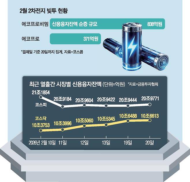 코스닥에서 개인투자자의 빚투가 집중된 종목은 2차전지 대장주였다. 코스콤에 따르면 이달 결제일 기준 20일까지 에코프로비엠의 신용융자잔액은 838억원, 에코프로는 371억원 순증했다. 증권가에서는 로봇용 배터리 수요 기대와 리튬 가격 하향 안정화 호재 등이 상당 부분 반영됐다는 평가가 나오지만 개인투자자들은 추가 상승 여력이 남았다고 보고 베팅을 이어가고 있다. 이용욱 한화투자증권 연구원은 "2차전지주의 주가 하방 경직성은 확보됐지만 단기적으로 강하게 반등하기도 부담스러운 박스권 구간"이라고 말했다.